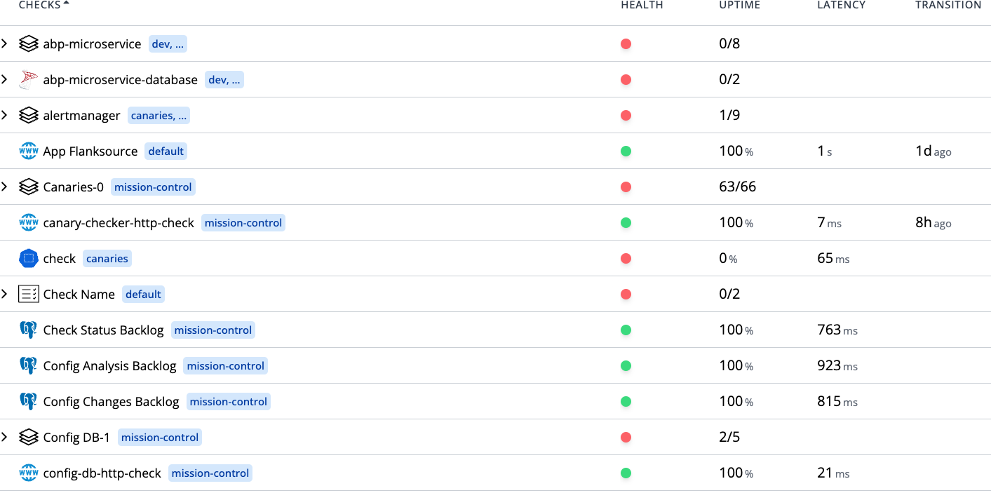 The health checks page provides a high-level view of the overall health of all services, infrastructure, and applications. It surfaces recent failures and provides high-level latency and reliability metrics.